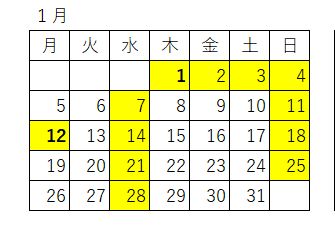 1月の休診日は次の日程となっております。 カレンダー黄色が休診日となっております。