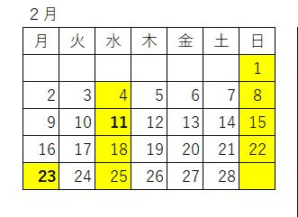 2月の休診日は次の日程となっております。 カレンダー黄色が休診日となっております。
